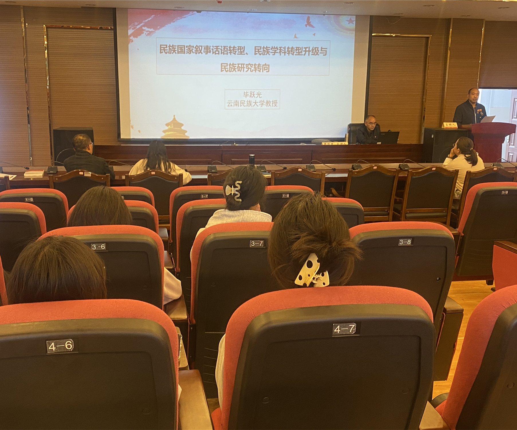 毕跃光教授从党的十八大以来民族国家叙事话语转型与民族工作转向、当下的民族学转型升级、当前的民族研究转向三个方面,结合丰富的史料和生动的案例进行讲授。他深入分析了新时代党的民族理论研究路径的新方向,为师生们提供了宝贵的学术见解和研究思路。