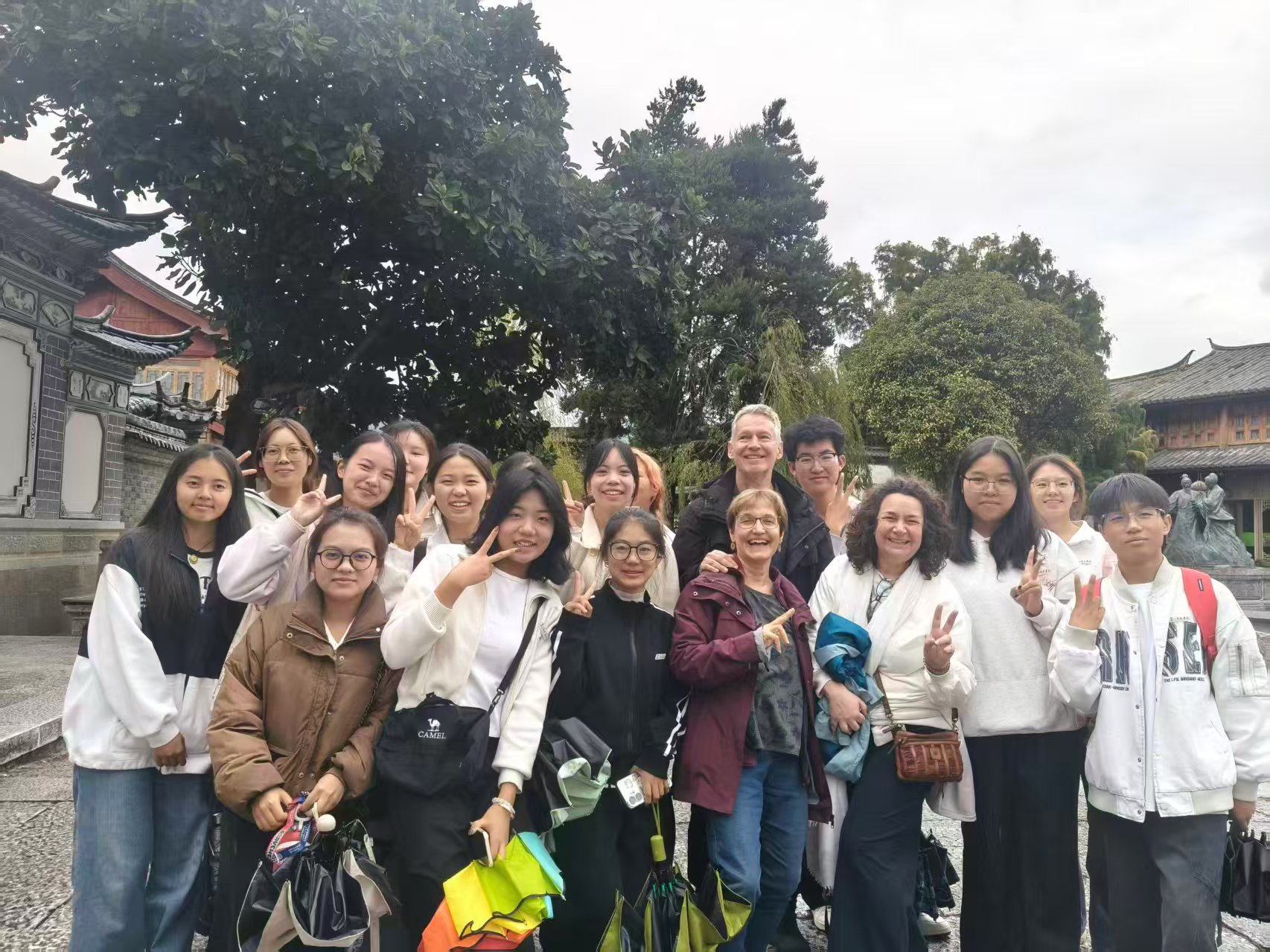 下午一点三十分,队员们于学校东门口集合完毕。雨水纷飞,浇不灭澎湃的心,欢声笑语盈满车厢。两点左右,队员们陆续抵达木府博物院门口,拍下合照。彼时,旁边有几位外国友人经过,大家互相打起了招呼,在一片欢笑声中,大家合影留念。“茄子!”照片定格住了大家的笑脸。
