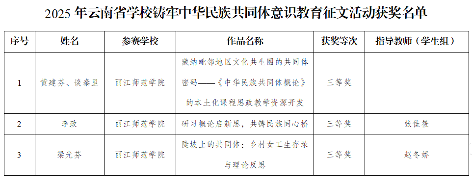 近日,2025年云南省学校铸牢中华民族共同体意识教育征文活动获奖名单揭晓,丽江师范学院师生三篇作品获评三等奖,在此次省级征文活动中取得良好成绩。